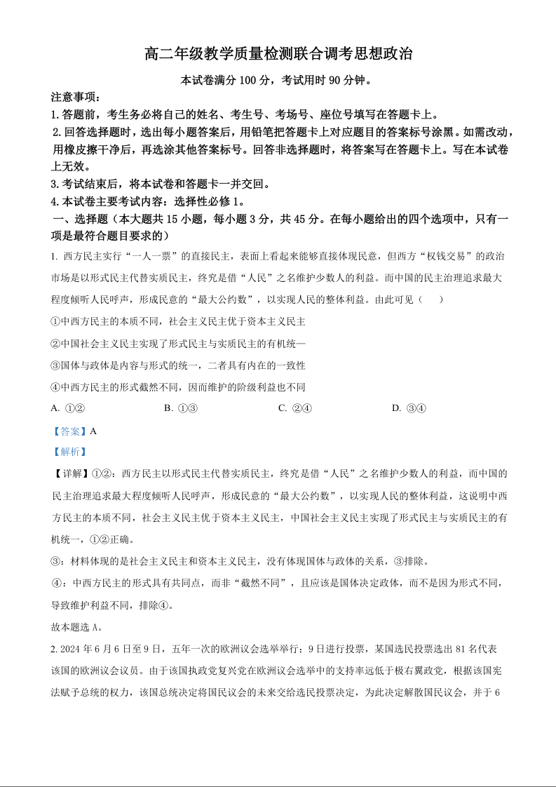山东省部分高中2024-2025学年高二上学期12月联考政治(解析版)