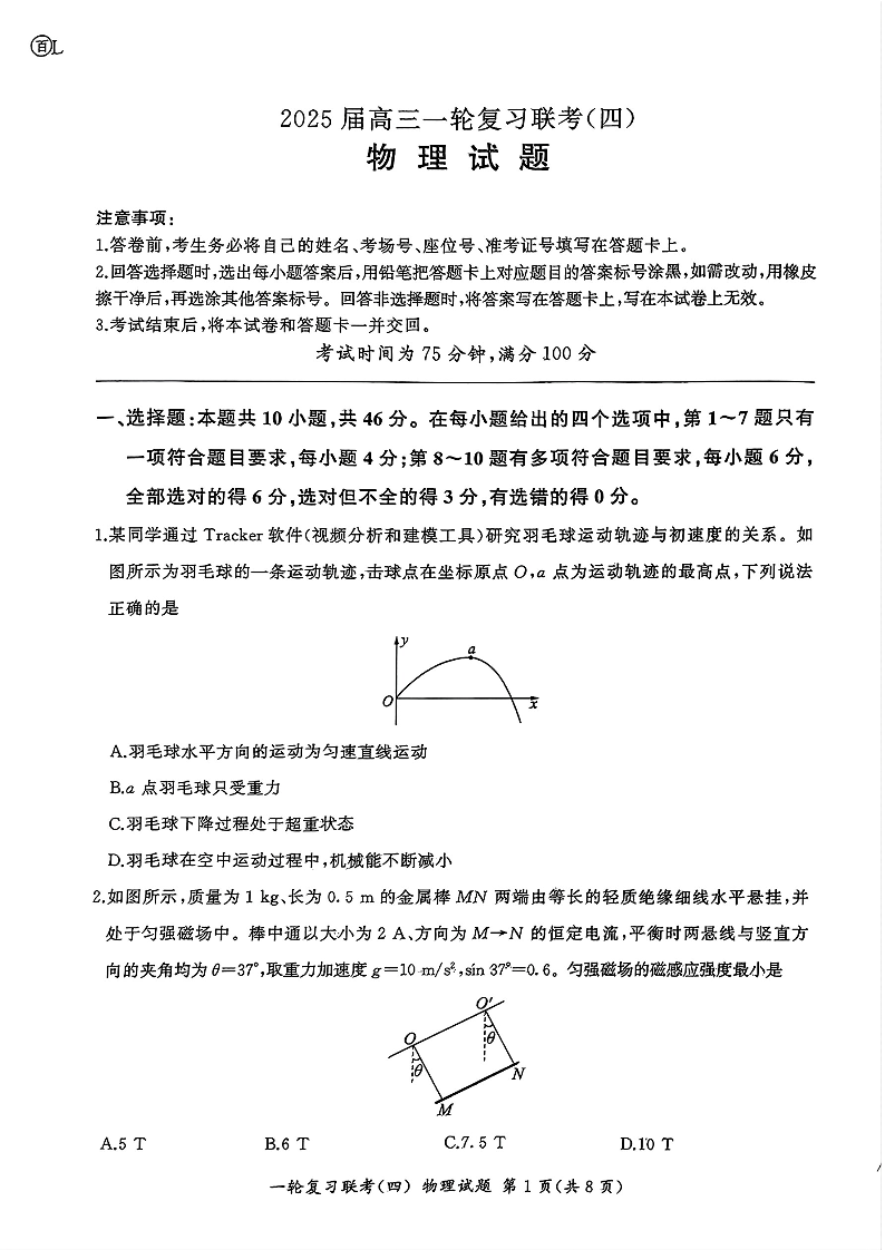 河北省区域高中2025届高三年级一轮复习联考(四)物理