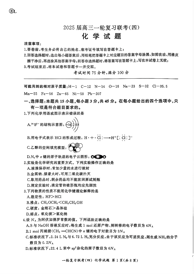河北省区域高中2025届高三年级一轮复习联考(四)化学