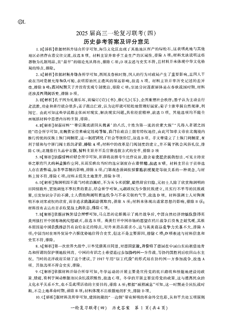 河北省区域高中2025届高三年级一轮复习联考(四)历史答案