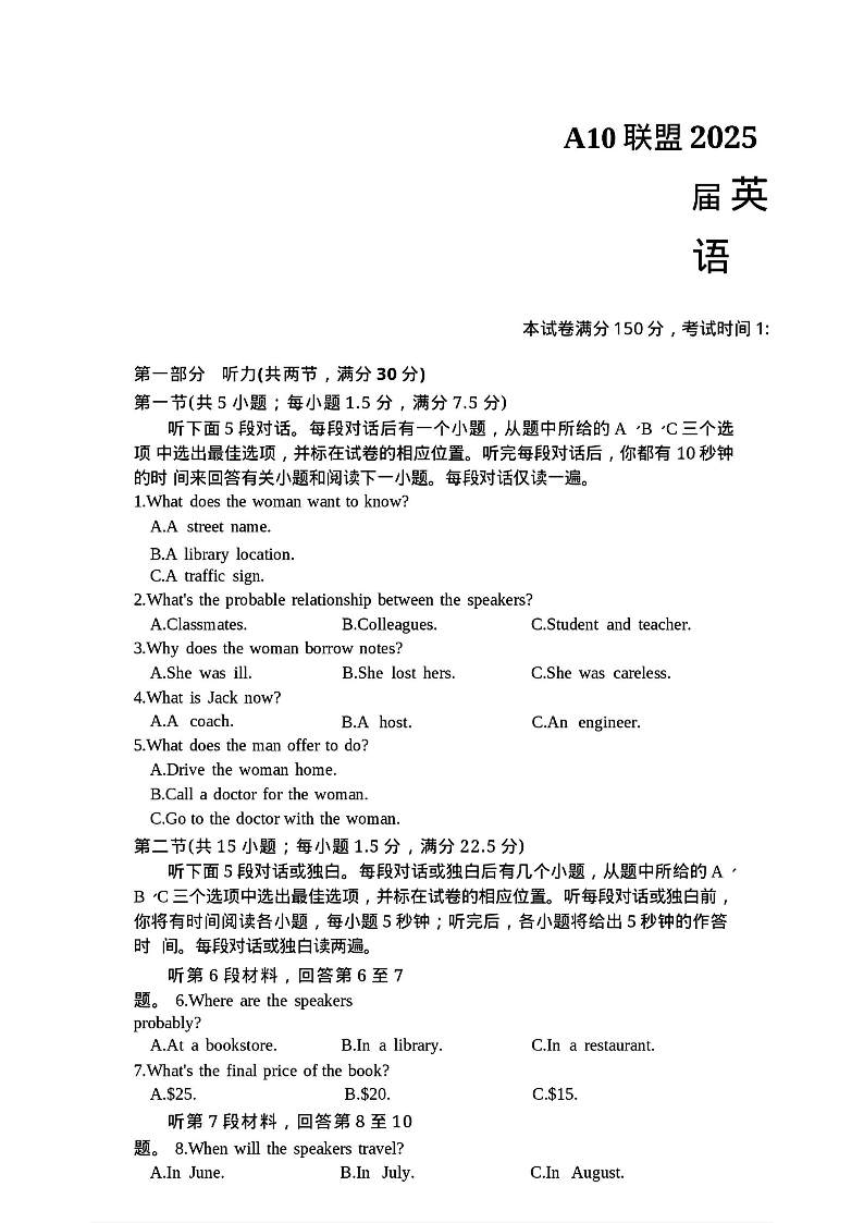 安徽省1号卷•A10联盟2025月高三上学期12月质检考英语