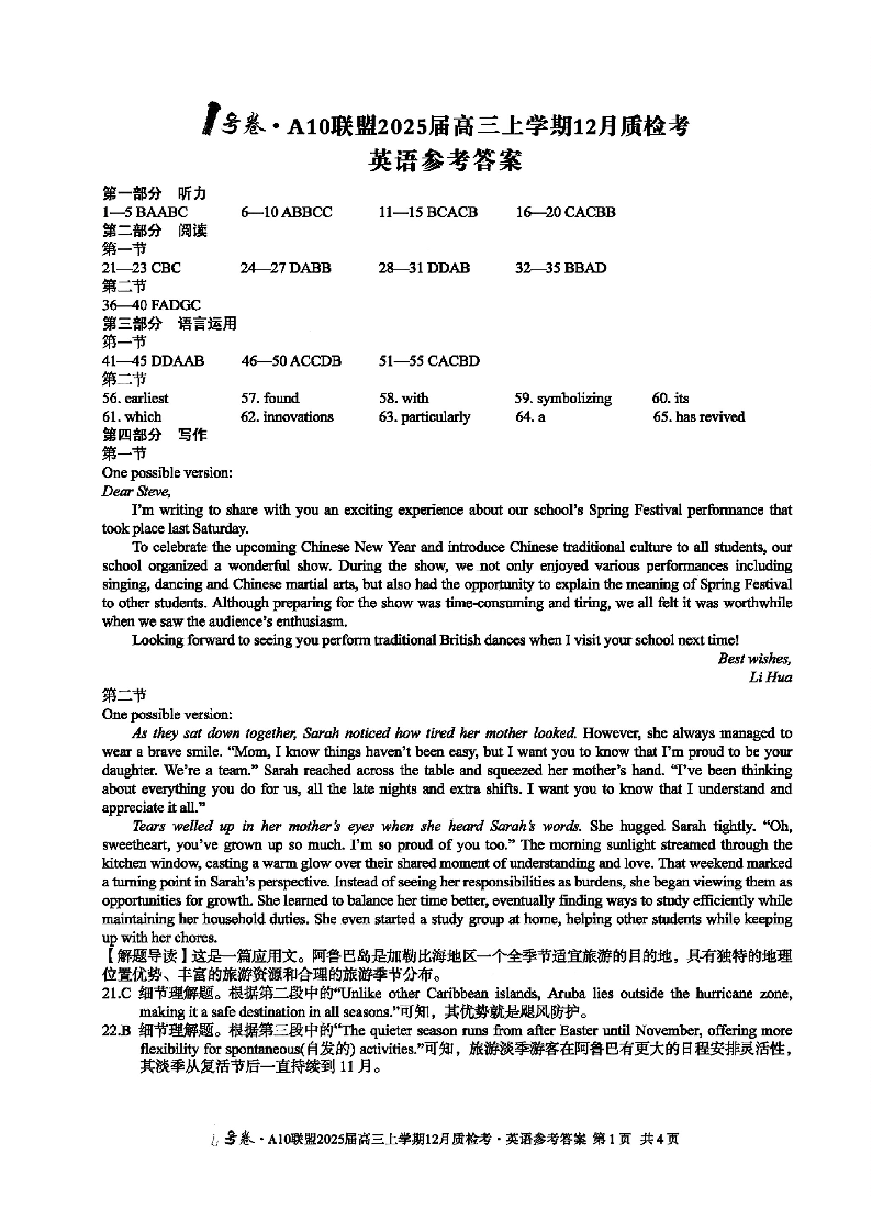 安徽省1号卷•A10联盟2025月高三上学期12月质检考英语答案