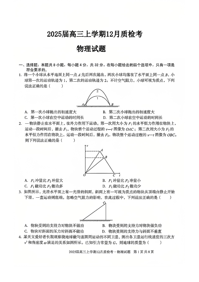 安徽省1号卷•A10联盟2025月高三上学期12月质检考物理+答案