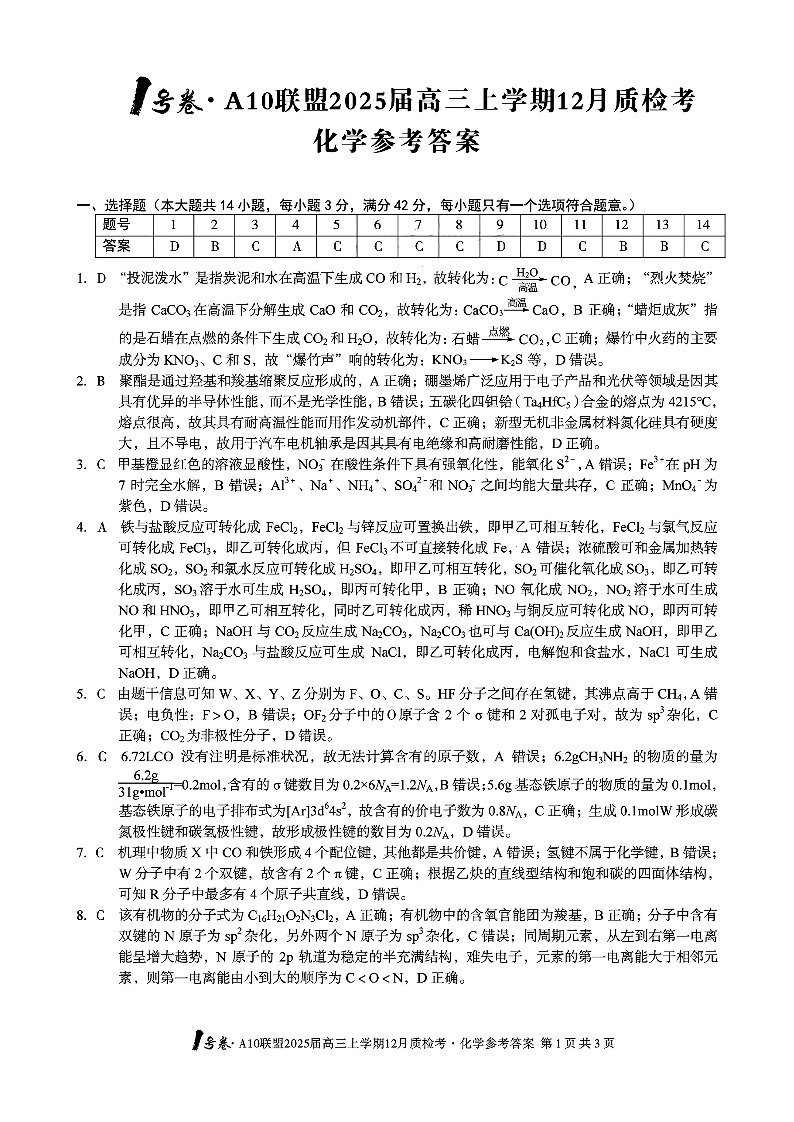 安徽省1号卷•A10联盟2025月高三上学期12月质检考化学答案