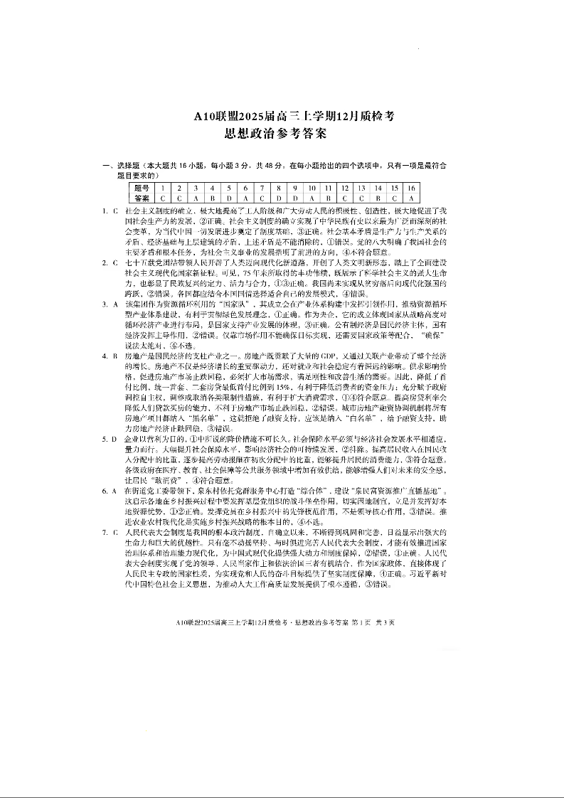 安徽省1号卷•A10联盟2025月高三上学期12月质检考政治答案