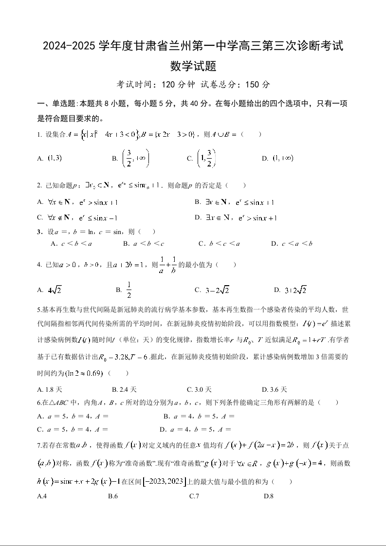 甘肃省兰州第一中学2025届高三上学期第三次诊断考试数学+答案