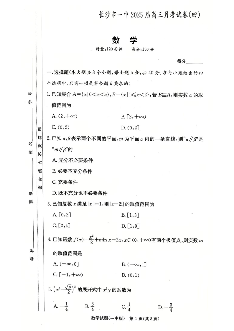 湖南省长沙市第一中学2025届高三上学期月考试卷(四)数学