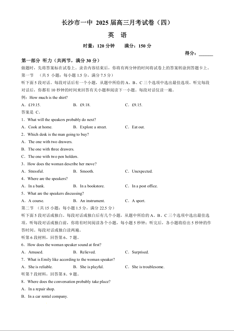 湖南省长沙市第一中学2025届高三上学期月考试卷(四)英语+答案