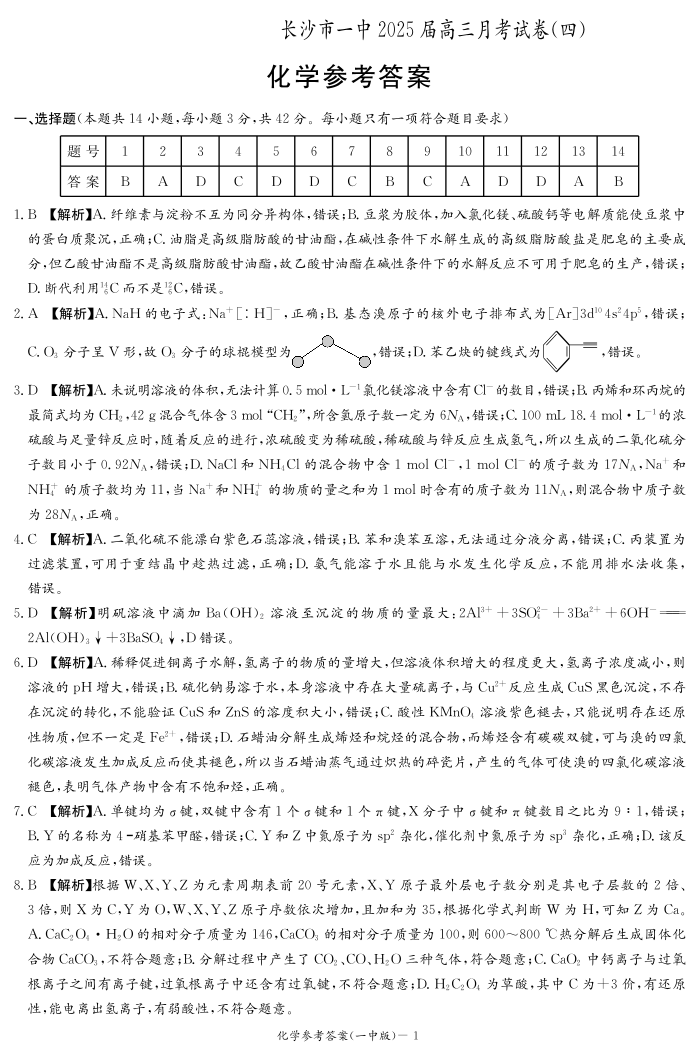 湖南省长沙市第一中学2025届高三上学期月考试卷(四)化学答案