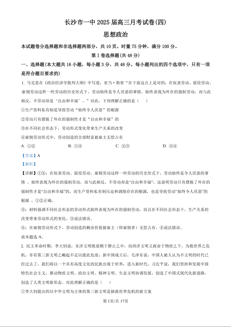 湖南省长沙市第一中学2025届高三上学期月考试卷(四)政治(精品解析版)