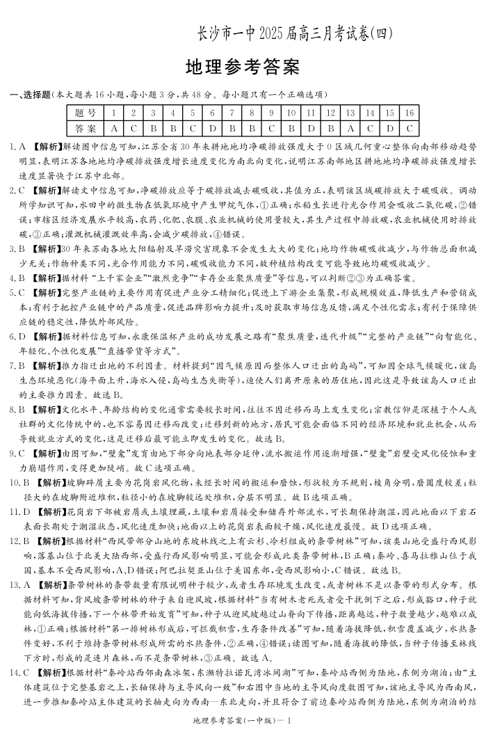 湖南省长沙市第一中学2025届高三上学期月考试卷(四)地理答案