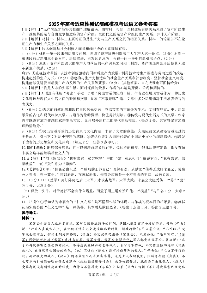 四川省成都市石室中学 2025 年高考适应性测试演练模拟考试语文答案