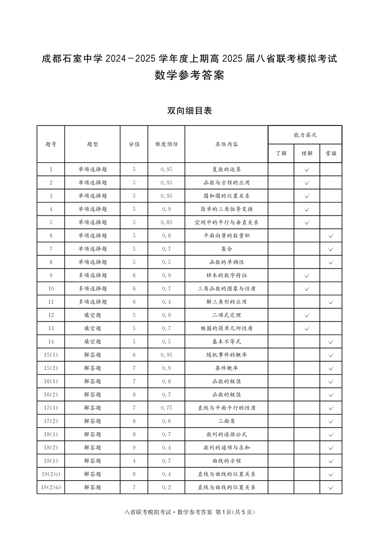 四川省成都市石室中学 2025 年高考适应性测试演练模拟考试数学答案