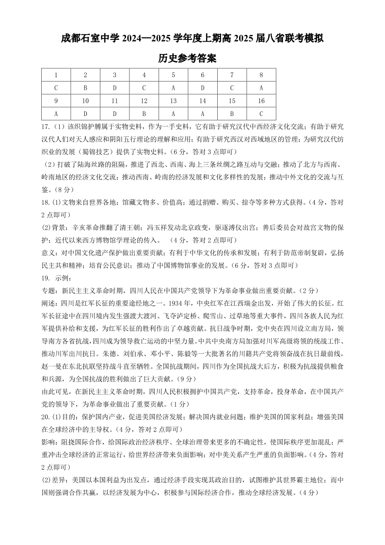四川省成都市石室中学 2025 年高考适应性测试演练模拟考试历史答案
