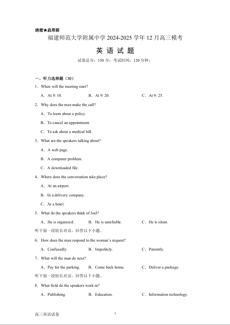 福建省师范大学附属中学2025届高三上学期二模英语+答案