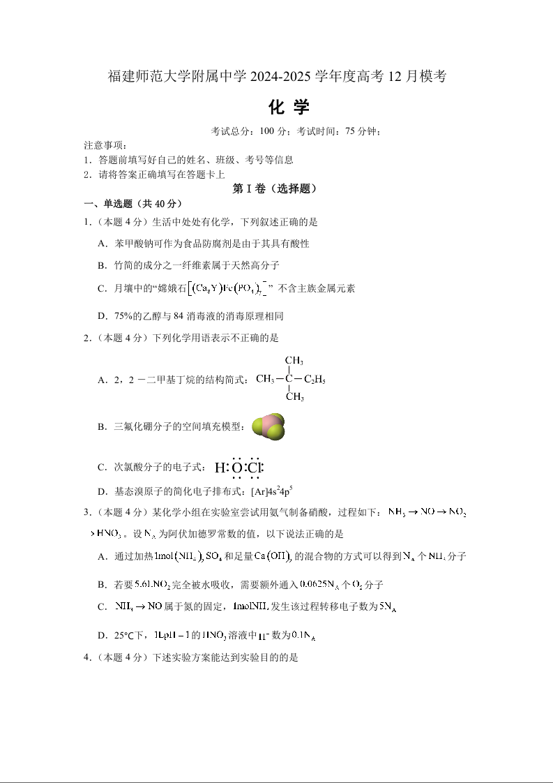 福建省师范大学附属中学2025届高三上学期二模化学
