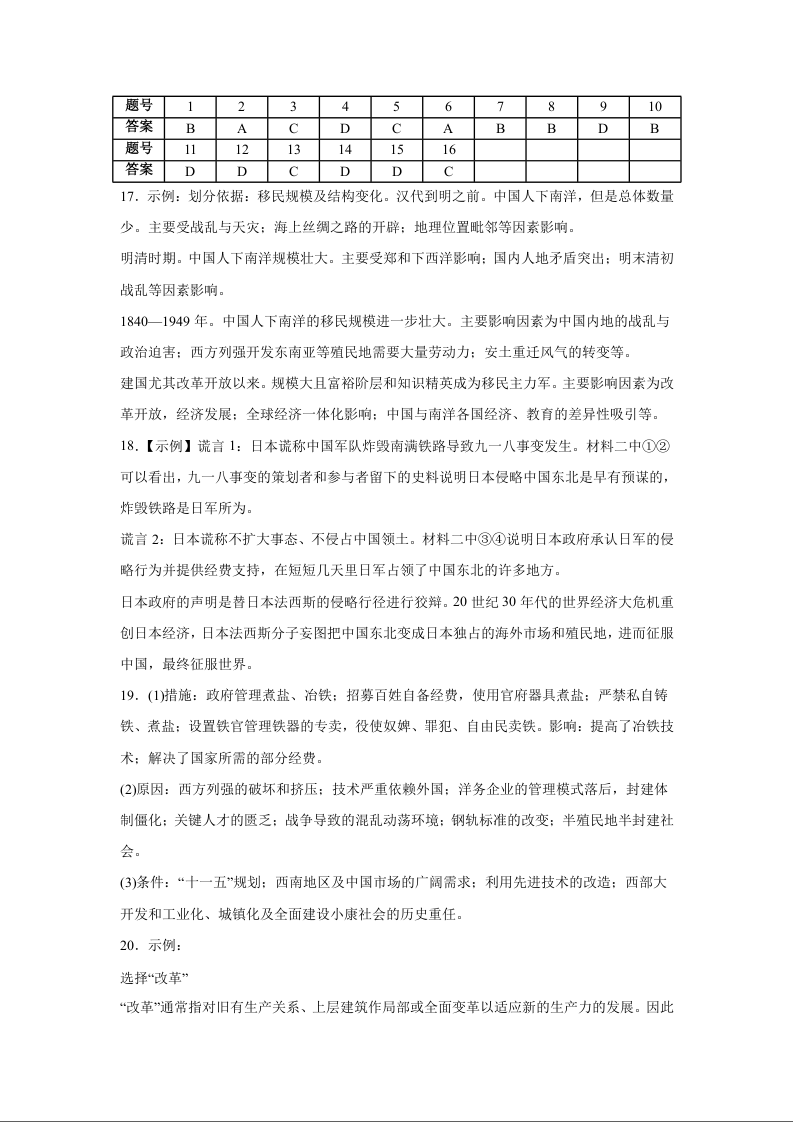 福建省师范大学附属中学2025届高三上学期二模历史答案
