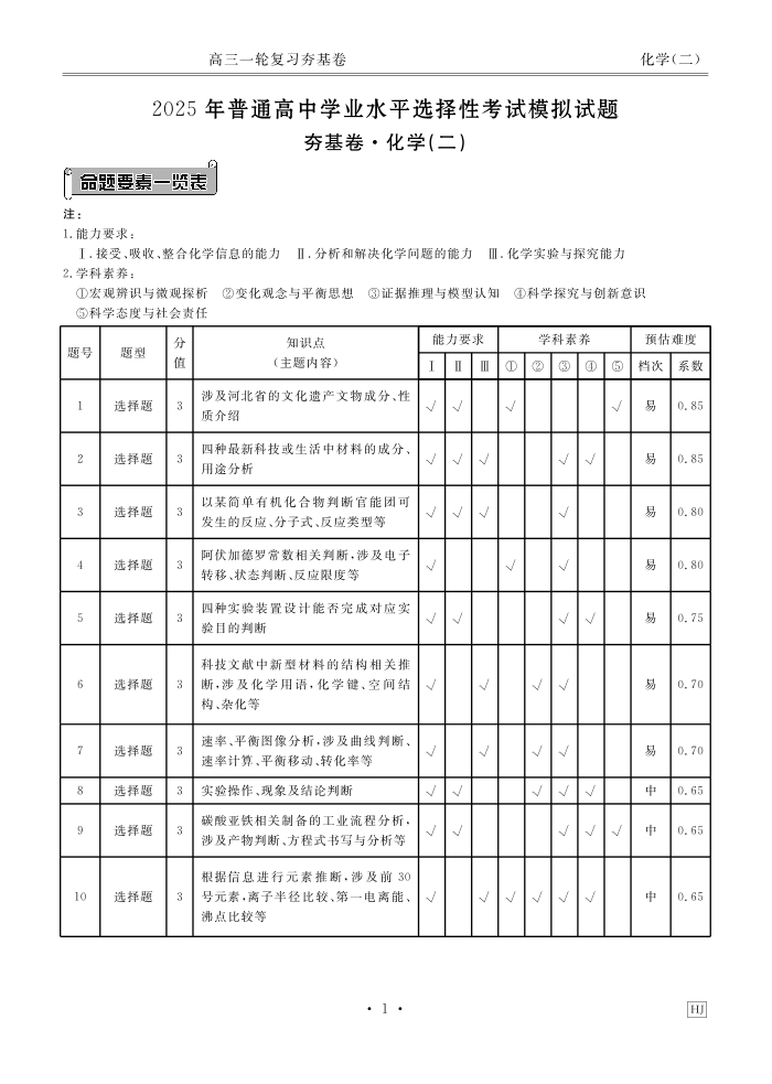 河北省衡水金卷先享题2025届高三一轮复习夯基卷(二)化学答案