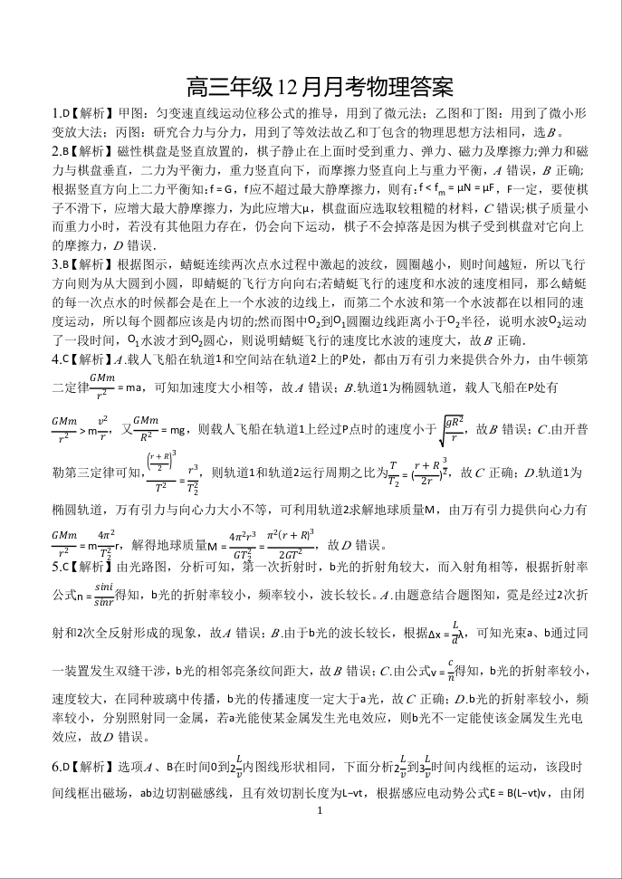 湖北省沙市中学2025届高三上学期12月月考物理答案