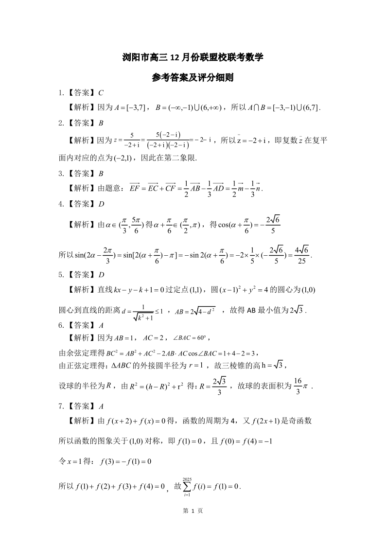 湖南省浏阳市联盟校2025届高三上学期12月联考数学答案