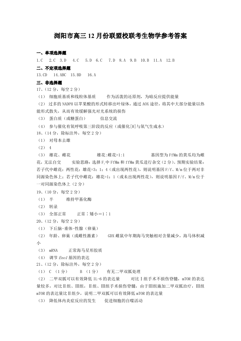 湖南省浏阳市联盟校2025届高三上学期12月联考生物答案