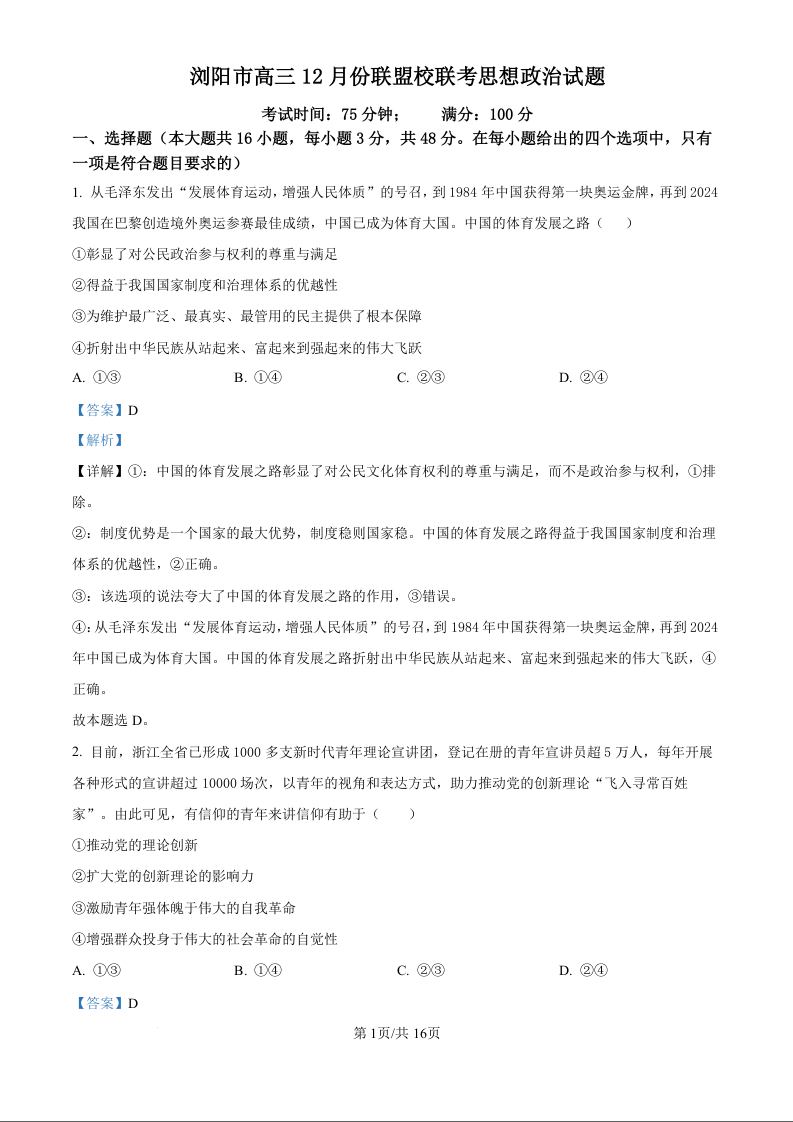 湖南省浏阳市联盟校2025届高三上学期12月联考政治(精品解析版)