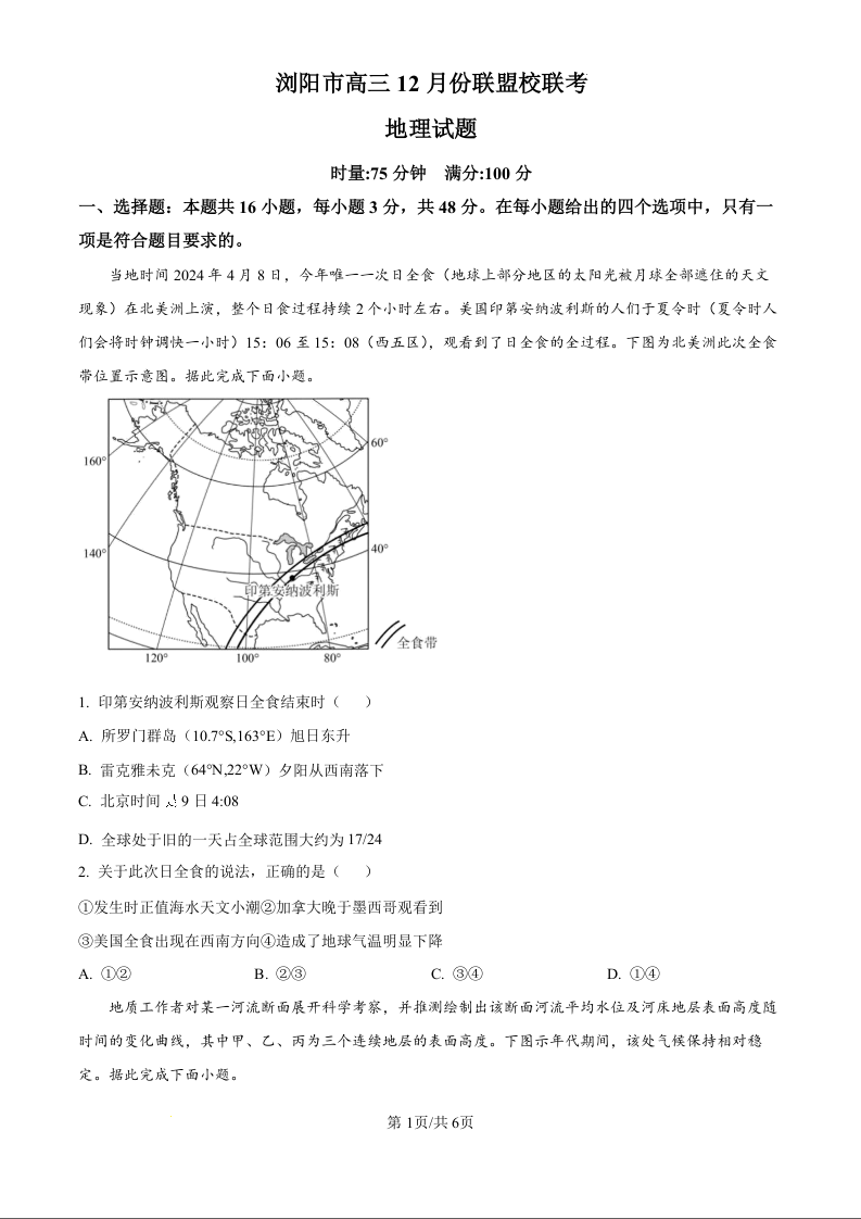 湖南省浏阳市联盟校2025届高三上学期12月联考地理(原卷版)