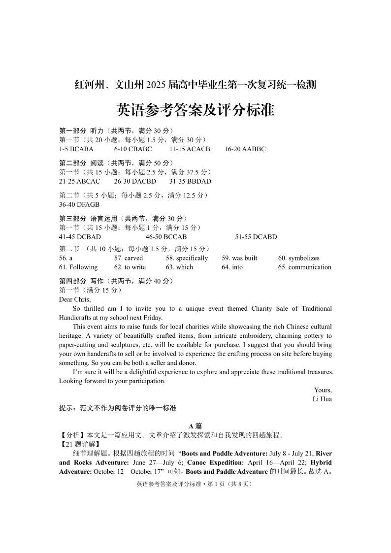 云南省红河州、文山州2025届高中毕业生第一次复习统一检测英语答案