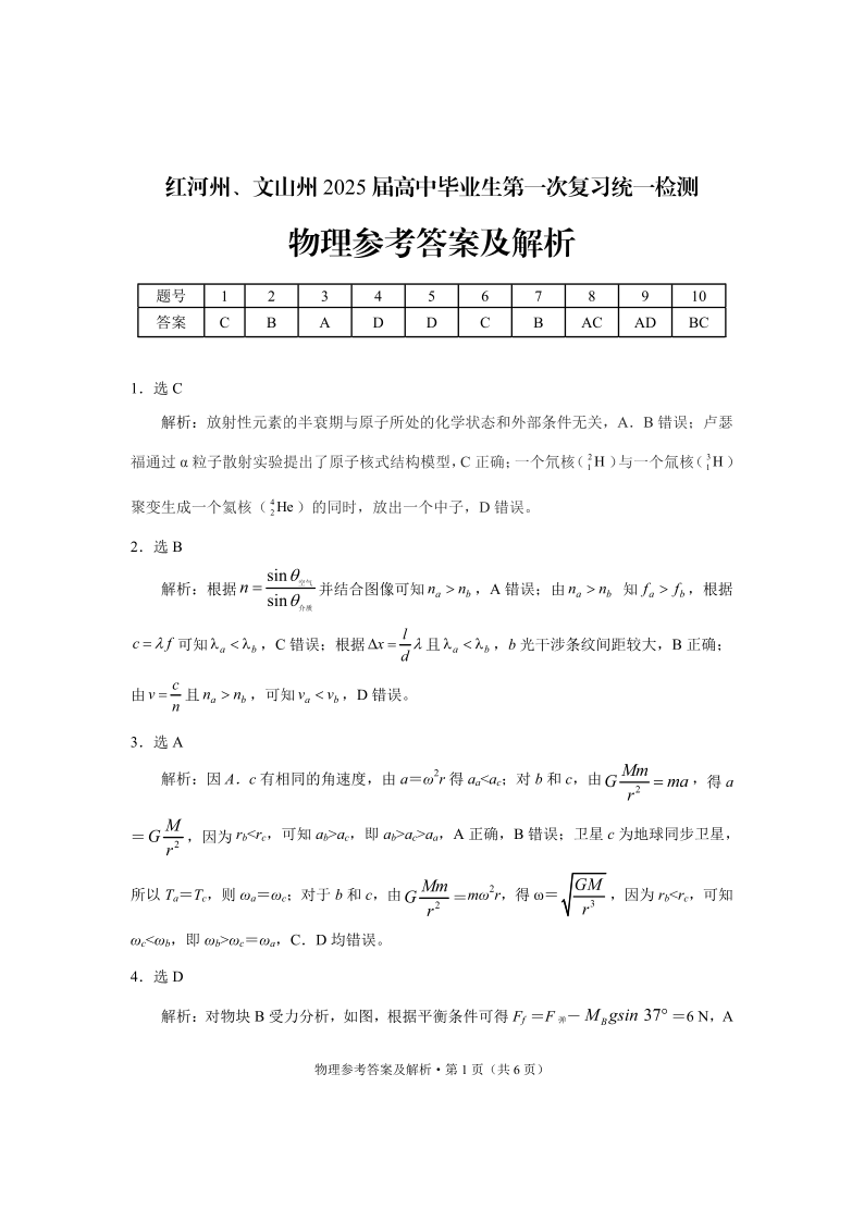 云南省红河州、文山州2025届高中毕业生第一次复习统一检测物理答案