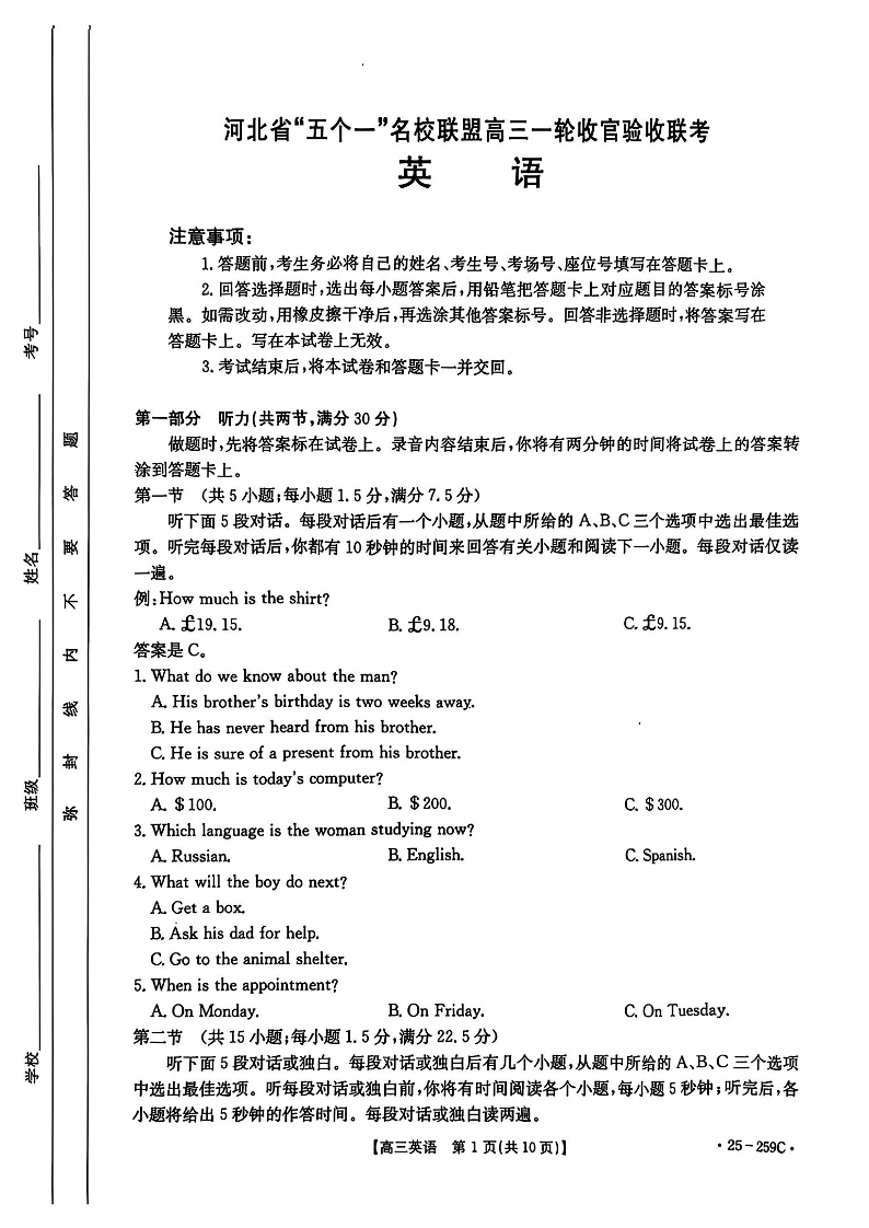 河北省五个一名校联盟2025届高三上学期一轮收官验收暨12月月考英语