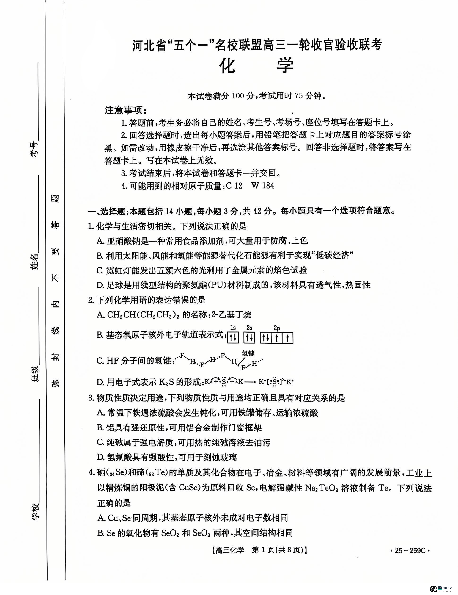 河北省五个一名校联盟2025届高三上学期一轮收官验收暨12月月考化学+答案