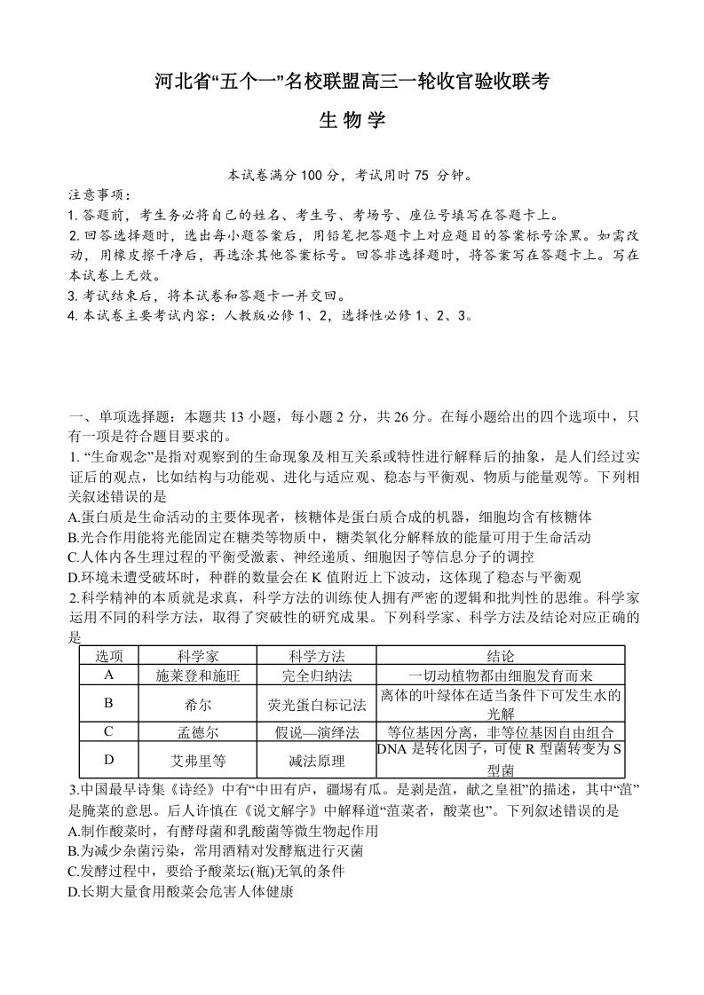 河北省五个一名校联盟2025届高三上学期一轮收官验收暨12月月考生物+答案