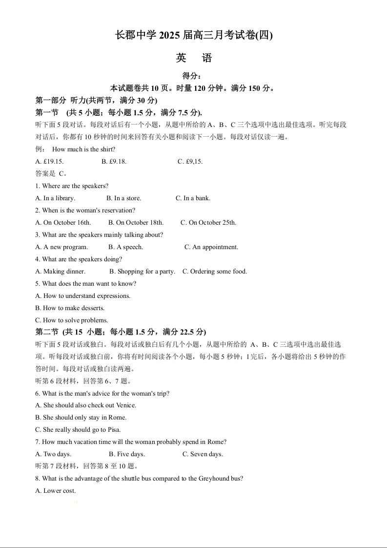 湖南省长沙市长郡中学2025届高三上学期月考(四)英语+答案
