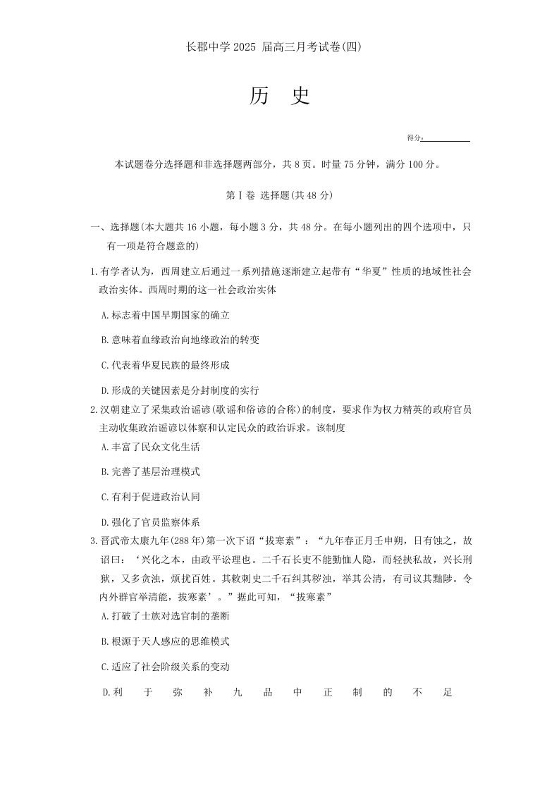 湖南省长沙市长郡中学2025届高三上学期月考(四)历史