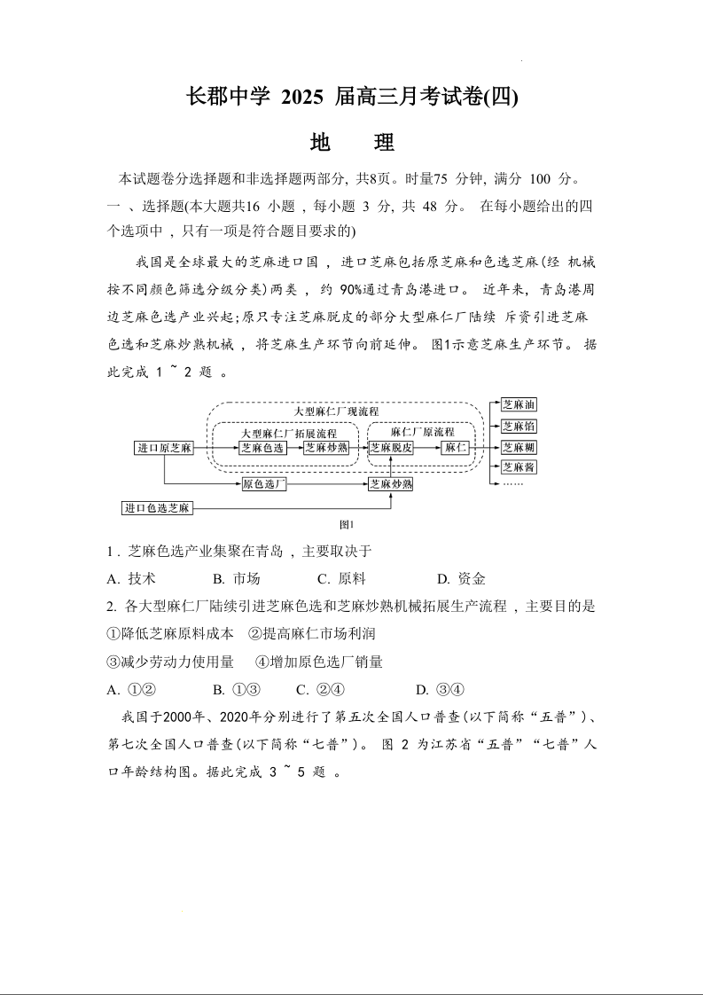 湖南省长沙市长郡中学2025届高三上学期月考(四)地理