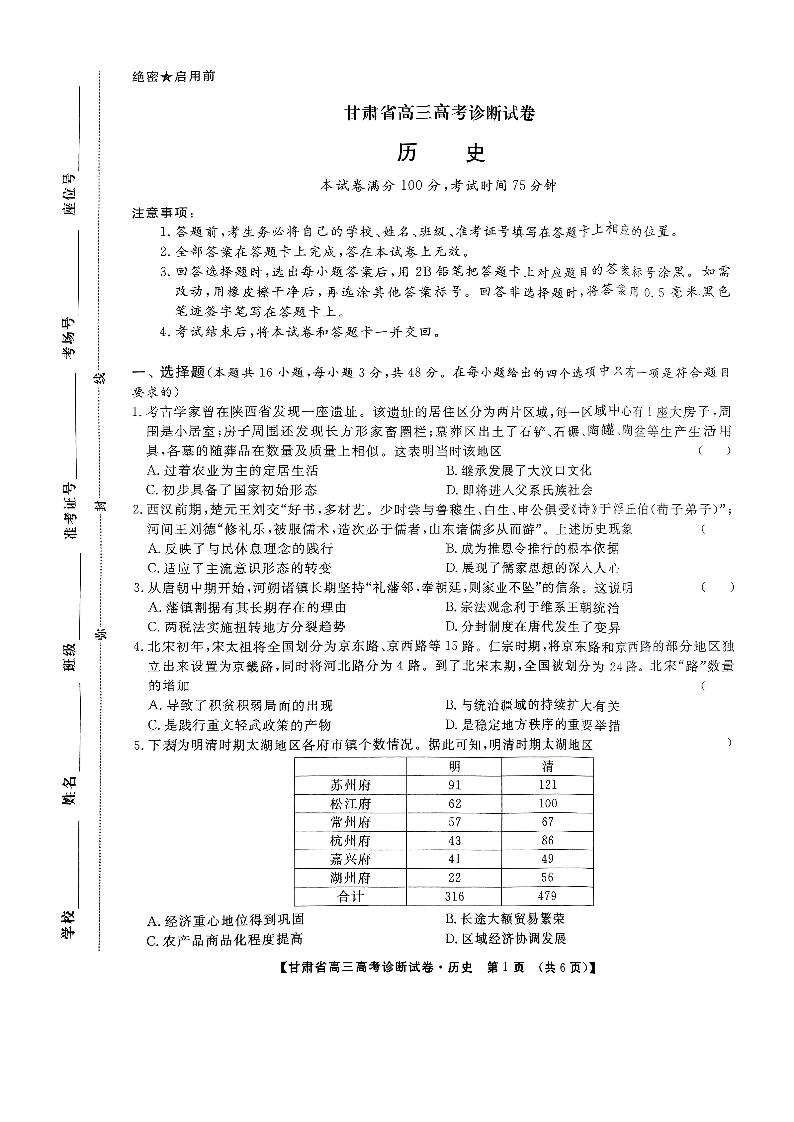 甘肃省2025届高三上学期12月高考诊断历史+答案