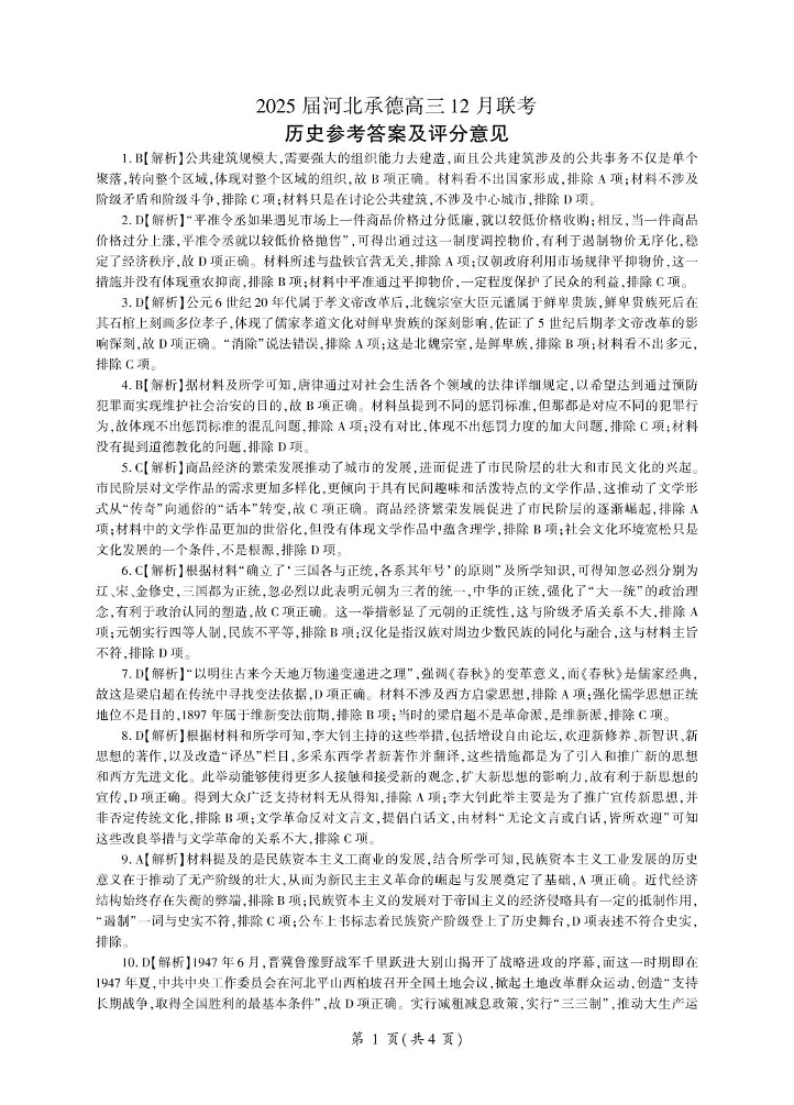 河北省承德市2025届高三上学期12月联考历史答案