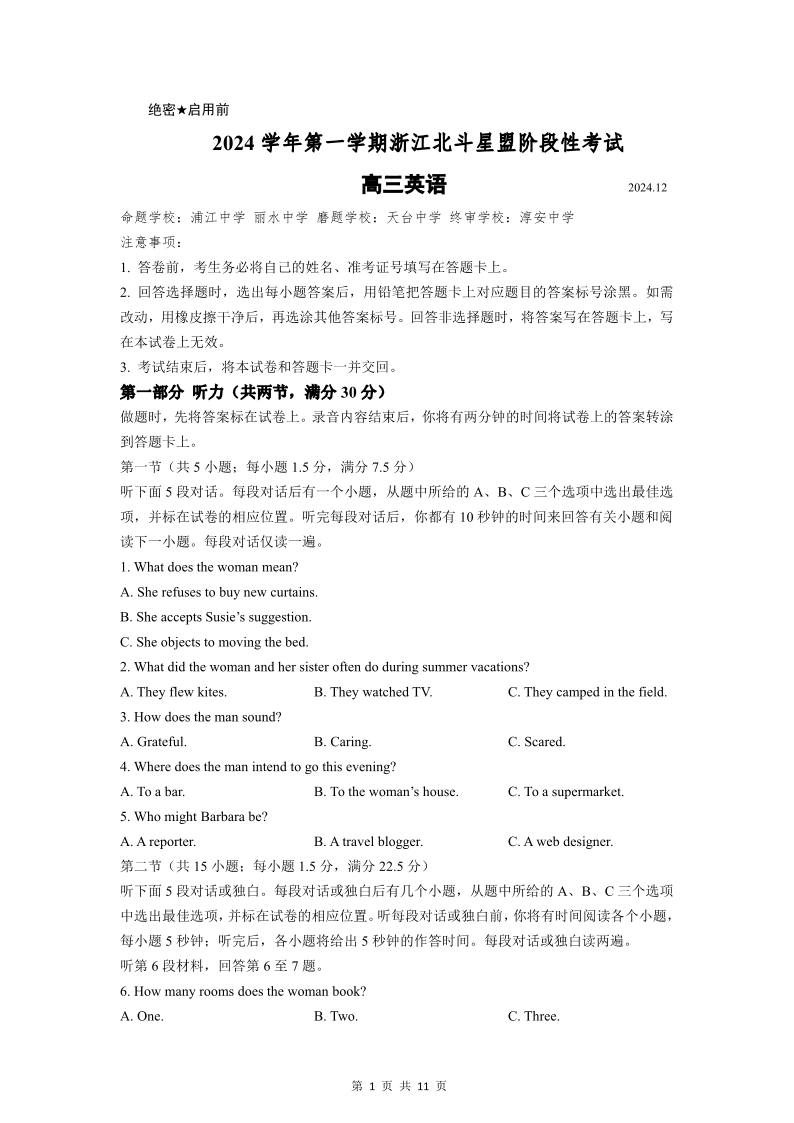 浙江省北斗星盟2025届高三上学期12月适应性考试英语