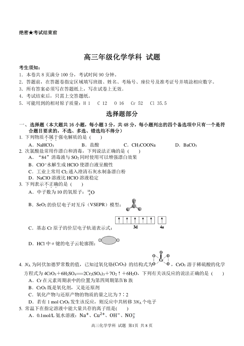 浙江省北斗星盟2025届高三上学期12月适应性考试化学+答案