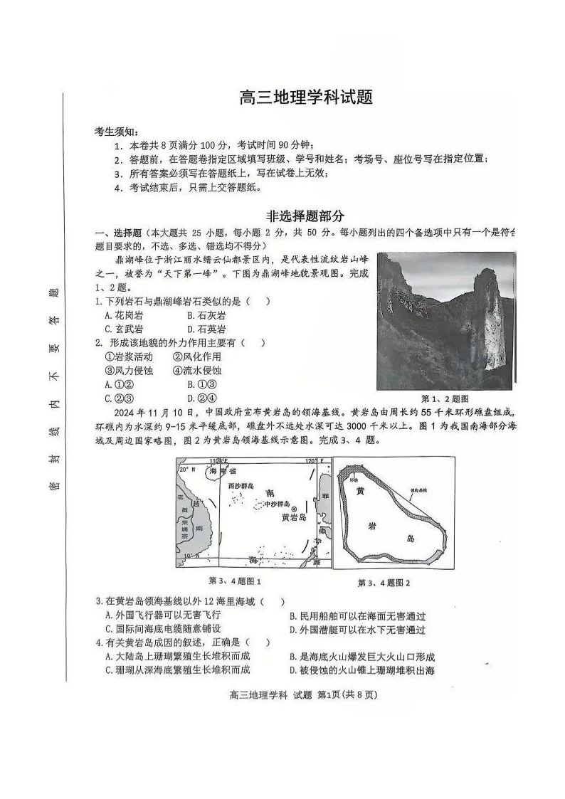 浙江省北斗星盟2025届高三上学期12月适应性考试地理+答案