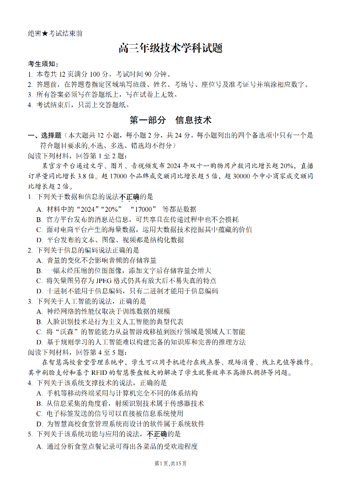 浙江省北斗星盟2025届高三上学期12月适应性考试技术+答案
