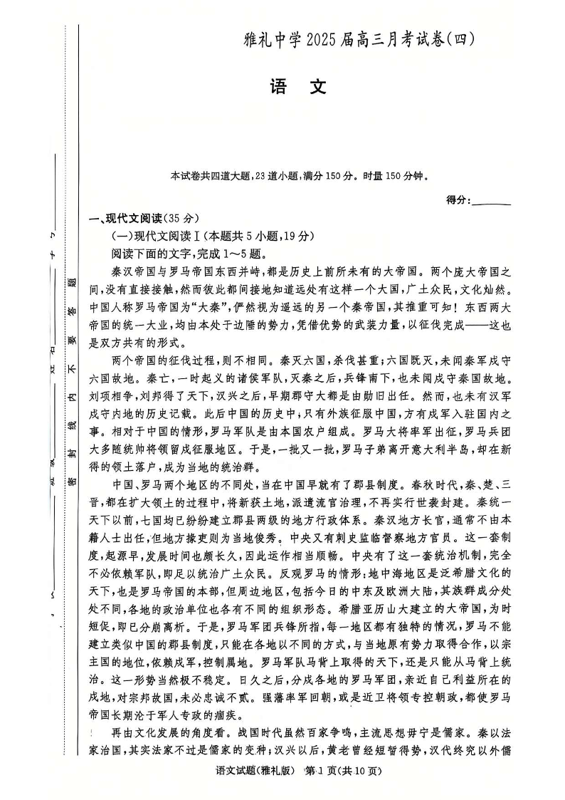 湖南省长沙市雅礼中学2025届高三上学期月考(四)语文
