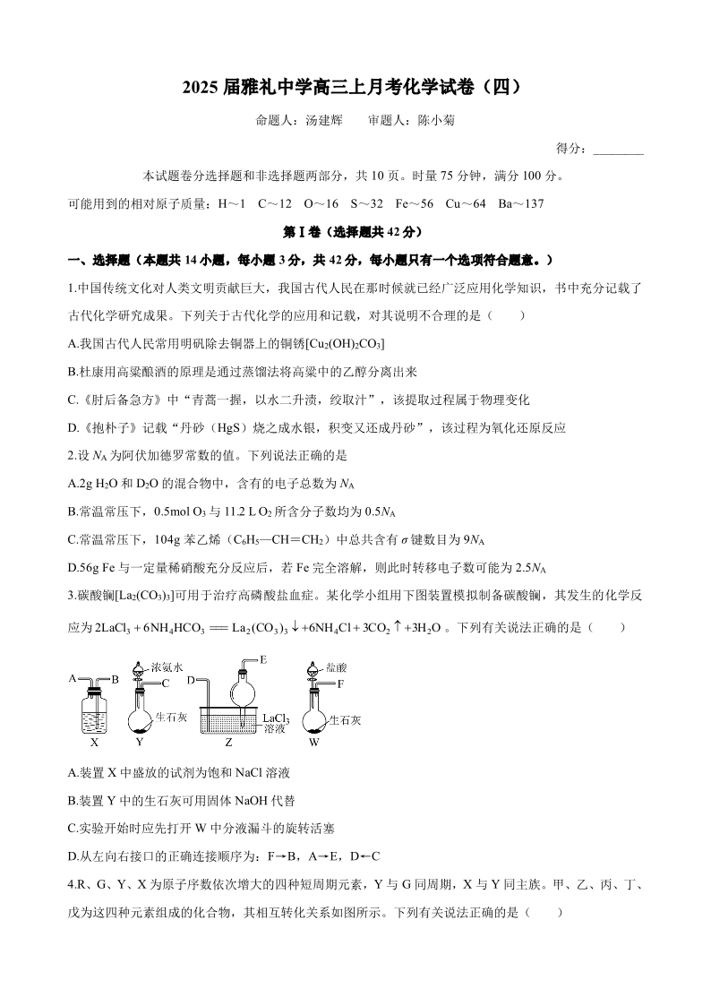 湖南省长沙市雅礼中学2025届高三上学期月考(四)化学