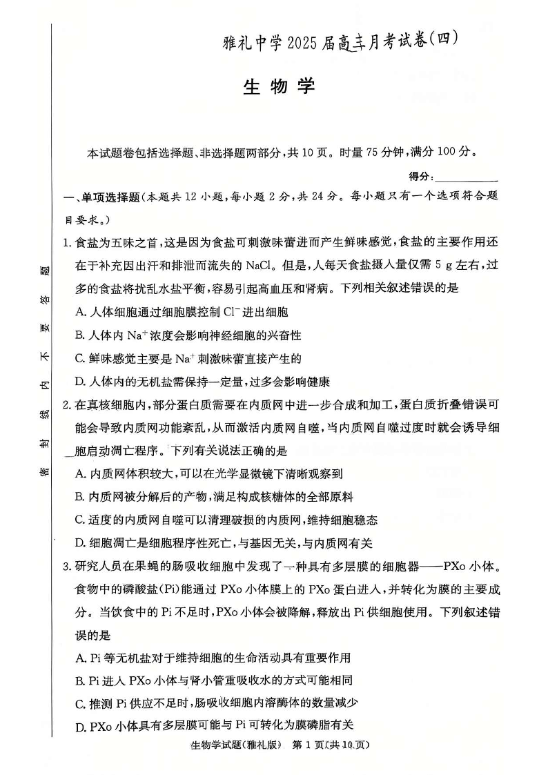 湖南省长沙市雅礼中学2025届高三上学期月考(四)生物