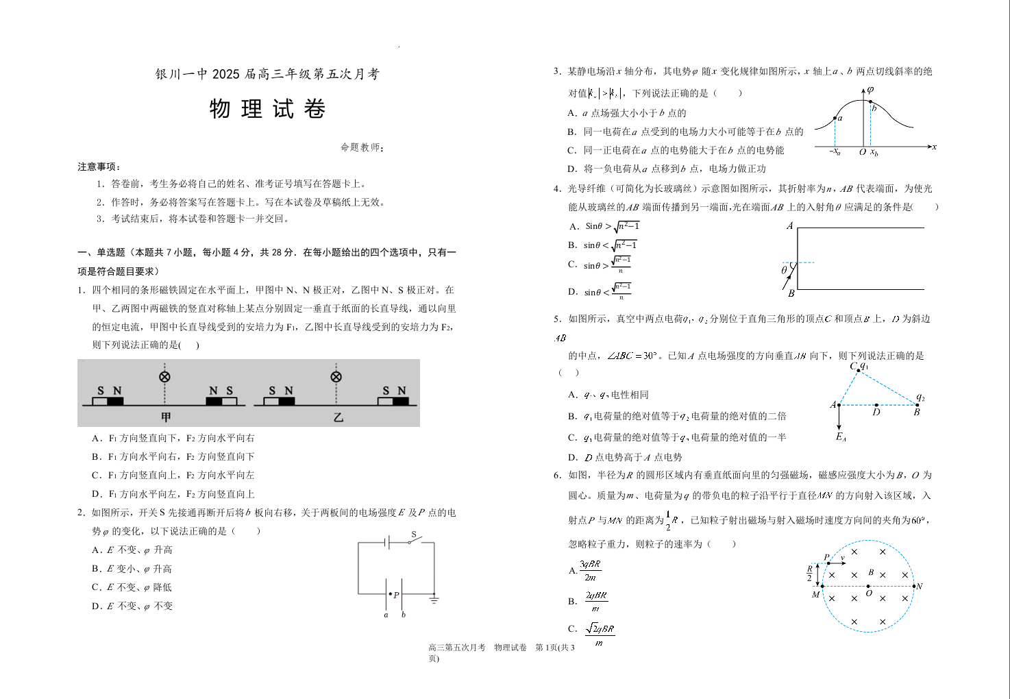 宁夏回族自治区银川一中2025届高三上学期第五次月考物理