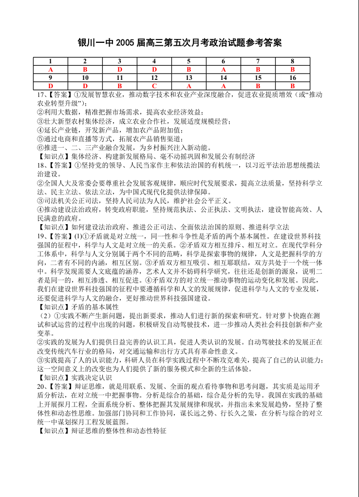 宁夏回族自治区银川一中2025届高三上学期第五次月考政治答案