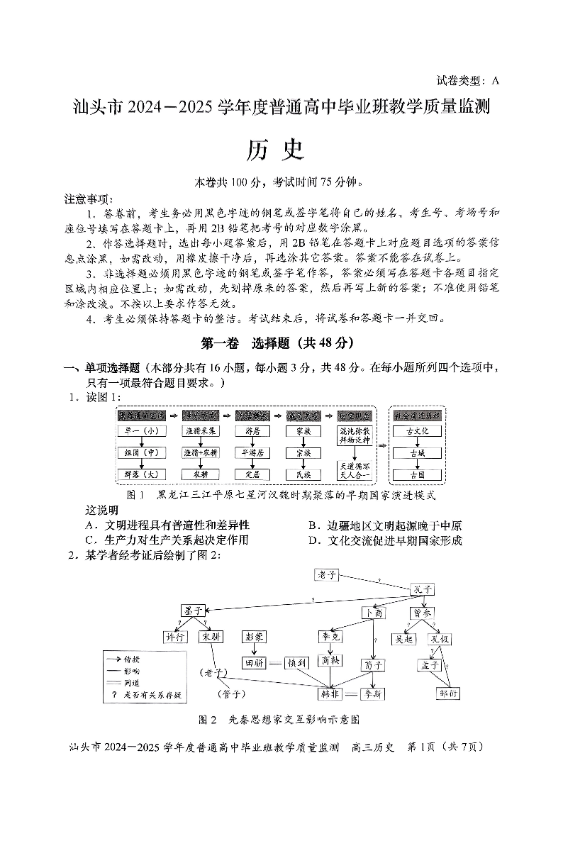 广东省汕头市2025届高三上学期12月期末教学质量监测历史