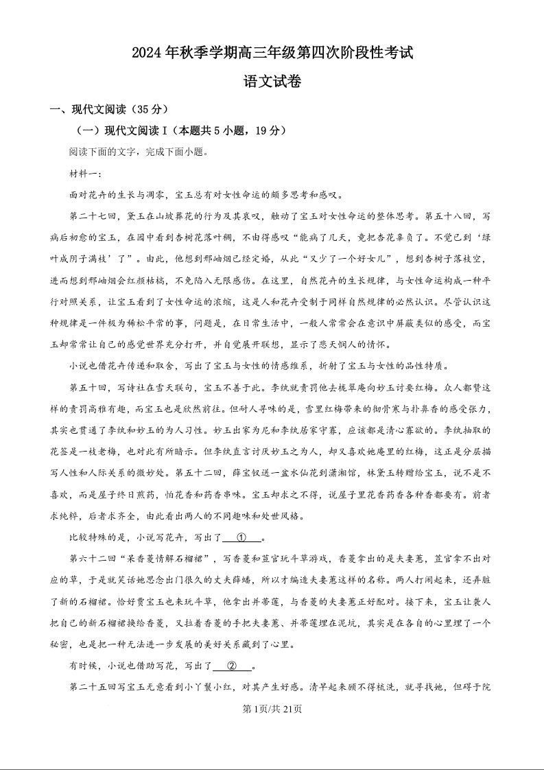 甘肃省平凉市一中等高中2025届高三上学期第四次阶段性考试语文(精品解析版)