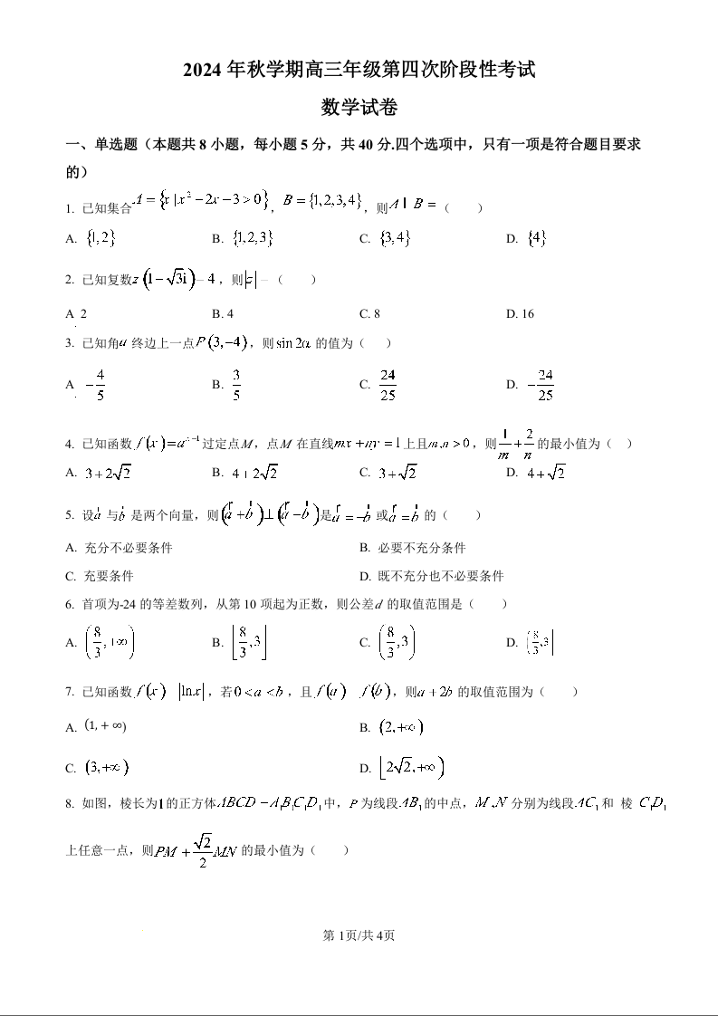 甘肃省平凉市一中等高中2025届高三上学期第四次阶段性考试数学(原卷版)
