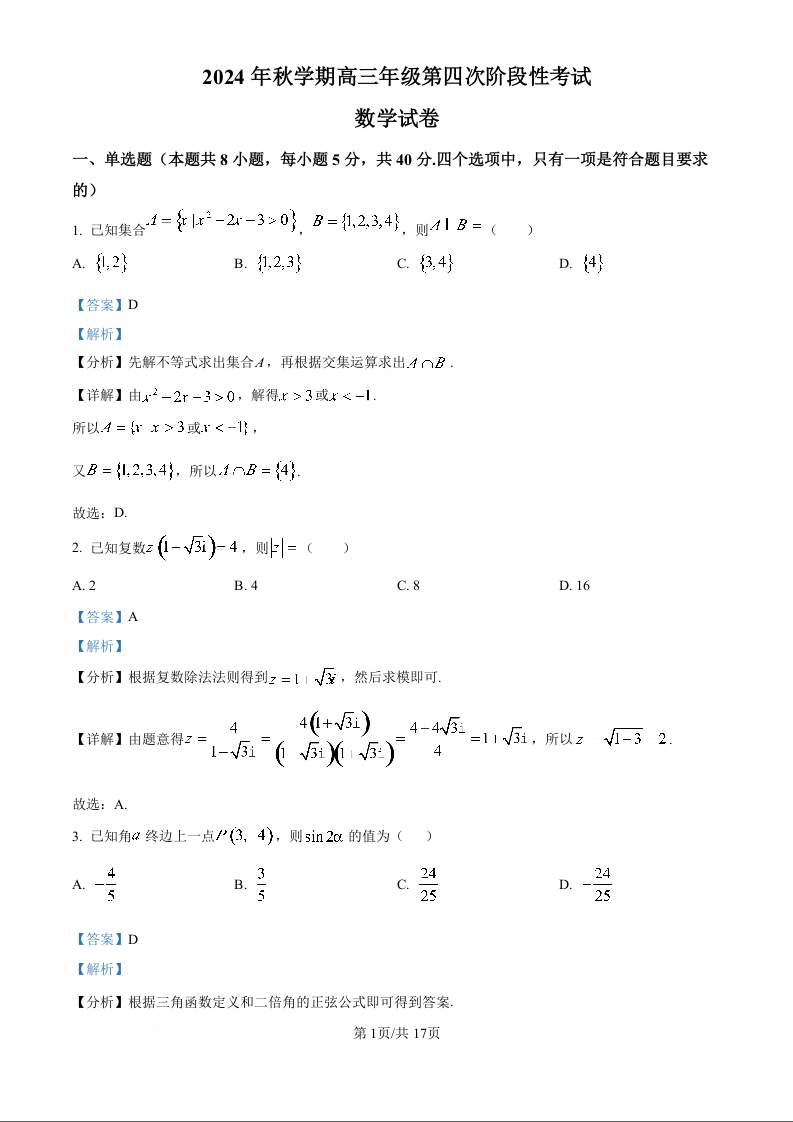 甘肃省平凉市一中等高中2025届高三上学期第四次阶段性考试数学(精品解析版)